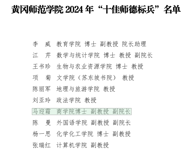 beat365体育官网马迎霜同志荣获黄冈师范学院2024年“十佳师德标兵”,beat365体育官网分工会评为先进基层工会,李传坤同志荣获优秀工会干部,桂海钦、李娜、吴俊辰、涂晶评为工会活动积极分子,何秀平、阮婧同志获黄冈师范学院2022—2023年度文明家庭荣誉称号。